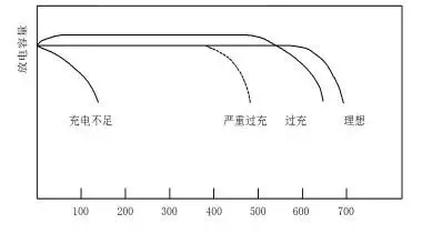 過充電的危害是必須對鉛酸電池進行均衡充電的重要原因。下圖為蓄電池各種充電狀態對其循環壽命的影響: